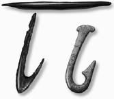 Между тем, как конструкция, рыболовный крючок не всегда был именно крючком, хотя, как приспособление для ловли рыбы, он известен с доисторического периода. Первые его «модели», обнаруженные при раскопках, представляют собой заостренный с двух сторон обломок кости с выточенной поперек канавкой для того, чтобы его можно было к чему-то привязать, и по форме ничего общего с крючком не имели (рис. 30). Прошло не одно тысячелетие, прежде чем это примитивное изделие приобрело привычные очертания. На самом деле достоверно не выяснено, когда рыболовный крючок был изобретен, во всяком случае, в эпоху неолита он уже был и изготавливался из костей, раковин и других подручных материалов.