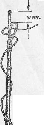 При глухой снасти удилище оборудуется мотовильцами для намотки лесы и в верхнем конце петелькой для закрепления лесы (рис. 3). Мотовильца устанавливаются обычно на втором от верха колене. Они делаются из тонкой латунной или медной проволоки, приматываются нитками и закрепляются клеем (БФ-2 или эпоксидным). Мотовильца для телескопического удилища могут оборудоваться на отдельной трубке.